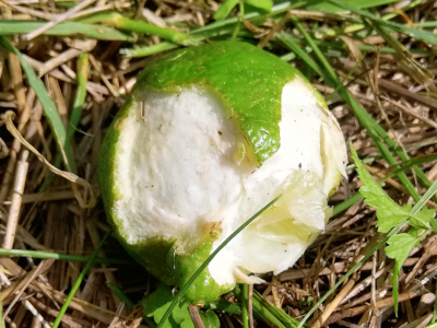 今年は初めて、グリーンレモンが何者かにかじられました。おそらく狸だと思いますが、レモンが食害を受けるのはまれで、味をしめて被害が広がらないことを祈るばかりです。